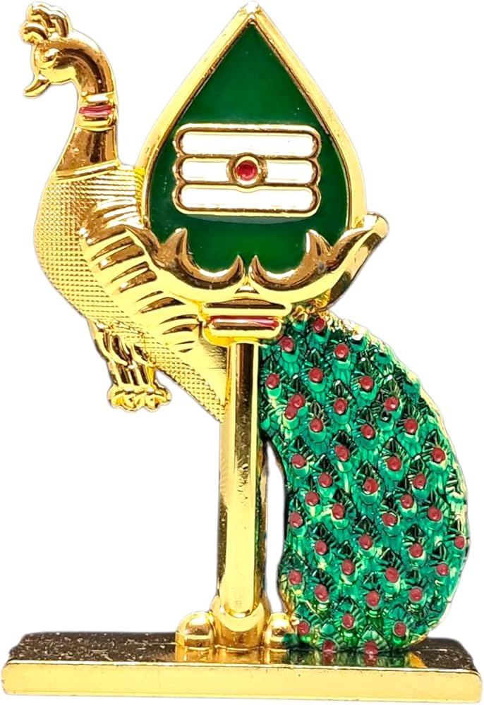 - This item is a double-sided Murugan Vel with Peacock idol, a popular Hindu devotional showpiece. It is made of metal, often with a gold-plated or multicolor finish, and is commonly used in pooja rooms, office desks, or as a car dashboard ornament.